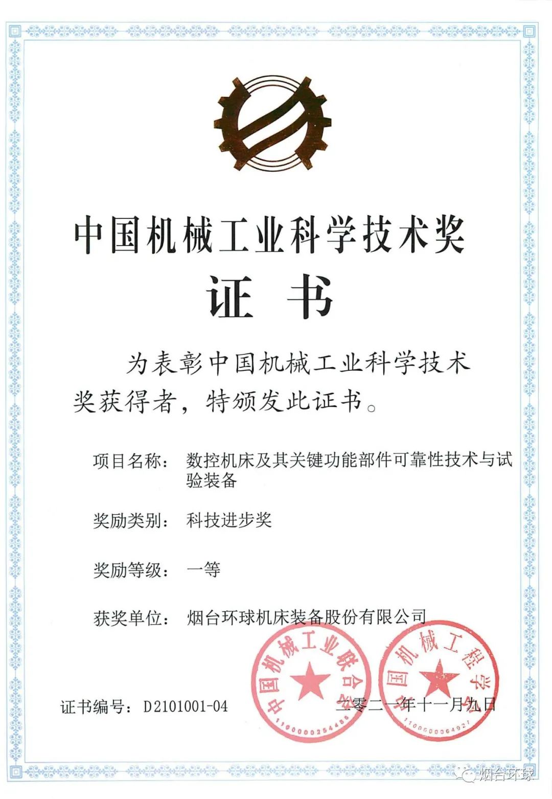 2021年末,中國機械工業聯合會發布2021年度科學技術進步獎項,煙臺環球參與的“數控機床及其關鍵功能部件可靠性技術與試驗裝備”項目獲得中國機械工業科學技術獎科技進步一等獎;